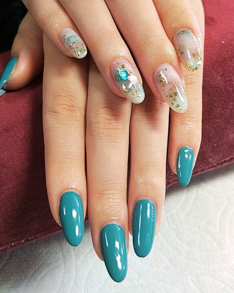 今回のネイルは、左右違うデザインにして欲しいとの依頼。片方はワンカラ・もう片方はタイダイ柄でアクセントカラーをワンカラーで使用したカラーにして統一感を持たせました。シェルが好きなお客様の為、今回もシェルを使用しました。